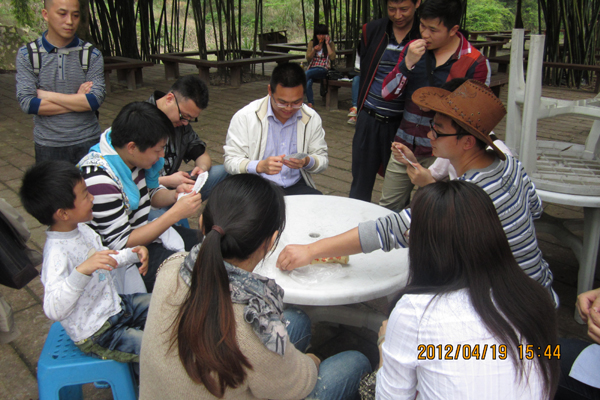經過愉快的車程,快到目的地時,大家已經迫不及待的想要下車,呼吸大自然的新鮮空氣。這里到處都是綠色的:山上、小草、亭子,就連小溪的水好像也是綠色的!大家都沉浸在這秀麗景色中,有說有笑、盡情游玩,有的玩撲克,有的吃東西,有的攝影,其樂融融,營造了一個和諧團隊氛圍。